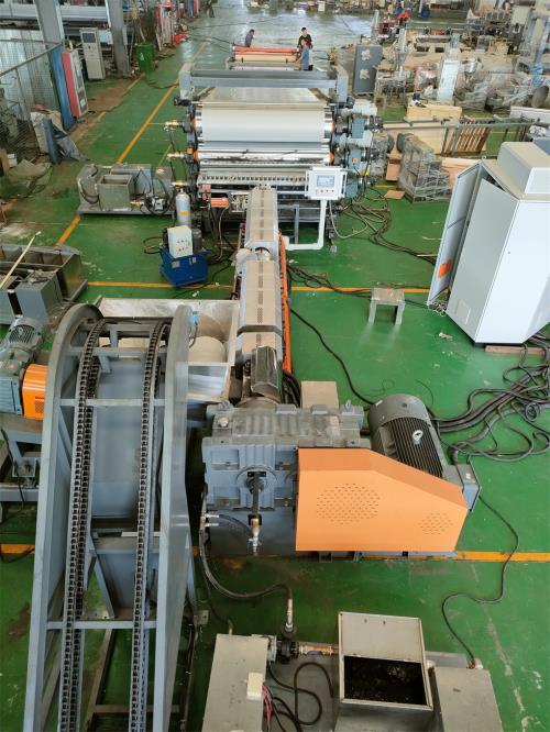 廢木粉填充高密度聚乙烯(HDPE)制備木塑復(fù)合 材料,用茂金屬聚乙烯(mPE SP1520)和POE分別對復(fù)合材料進行改性。在兩者用量小于12時增韌效果相差不大但用量大于12 時,用POE增韌的復(fù)合材料的沖擊強度和斷裂伸長率增加 迅速,而用 mPESP1520增加幅度 比較平緩。M.J.O.C.Guimaraes研究了HDPE與POE共混物的力學(xué)性能和熱性能。熱分析結(jié)果表明 HDPE和POE具隔音卷材生產(chǎn)線有良好的相容性,共混材料的拉伸強度和斷裂伸長率提高,當POE含量在10%左右時,材料在室溫下具有較高的強度和沖擊韌性。POE改性聚乙烯(PE)制備的發(fā)泡材料具有良好的彈性和強度,可用于制作粘合膠帶。將30份含離子結(jié)構(gòu)的PE和6.5份偶氮二甲酰胺加入到100份質(zhì)量比為3:7的POE和乙烯一辛烯(含量小于20%)聚合物 Affinity PL1845組成的混合物中,擠成片材后輻射交聯(lián),在250℃下發(fā)泡,隔音卷材生產(chǎn)線所得lmm厚的泡沫片材具有良好的韌性,其橫、縱方向的彎曲強度可分別達到3O.2MPa和24.3MPa POE未經(jīng)接枝改性 ,樹脂相與無機粒子形成相互分離的結(jié)構(gòu)。而 POE經(jīng)過馬來酸酐(MAH)接枝改性后與填料粒子的相容性提高,在熔融加工中形成樹脂包覆 無機粒子的結(jié)構(gòu),能充分發(fā)揮無機粒子對樹脂的增強或增韌作用。由于單純對POE接枝 MAH成本高,而且POE的軟化點低,所以在設(shè)備上隔音卷材生產(chǎn)線必須增加水環(huán)切粒,這樣不僅接枝物的接枝率高,熔體流動速率大,而且產(chǎn)品為白色透明顆粒,質(zhì)感好,無異味,改善了單純POE接枝加工上的困難,降低了成本。