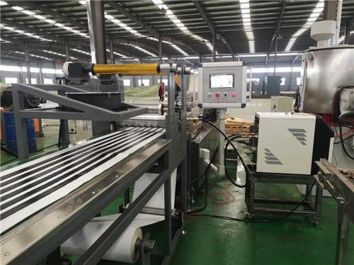 放卷裝置上安裝導(dǎo)流輥;展平輥等3)放卷手動(dòng)糾偏系統(tǒng)二套(六)橡膠輸送帶 1)輸送帶材質(zhì):PVC輸送帶600mm×5000mm;輸送帶里面加不銹鋼板鋪平2)輸送電機(jī)1.5kw采用:三晶變頻調(diào)速器,線速度0-10m/m;變頻器控制,3)橡膠輸送帶兩邊要帶槽道;防止輸送帶跑偏,輸送帶里加吸附功能;電機(jī)功率:1.5KW4)輸送帶安裝5KG自重壓輥2組;15KG氣動(dòng)壓輥1組;輥筒直徑:71mm;輥筒;防止粘連,氣動(dòng)壓輥行程可調(diào)(采用:機(jī)械調(diào)節(jié)閥那種);最大高度50mm5)切邊刀系統(tǒng)一套(七)壓花輥筒一套 1)上輥直徑:150mm,長(zhǎng)度:600mm 壓花棍,采用加大氣缸自動(dòng)調(diào)整高度2)下輥直徑:150mm,長(zhǎng)度:600mm 橡膠光棍,采用變頻器控制;電機(jī)功率:2.2KW(八)JDL-500切刀系統(tǒng)1) 最大剪板寬度:500mm.丁基膠自粘片材擠出裁切精度要求控制:0.1mm,最大厚度:15mm,剪切速度,15m/min2) 剪板方式氣動(dòng);跟蹤裁斷,跟蹤長(zhǎng)度100mm,切刀有光電安全保護(hù)裝置,切刀上加羊毛刷;3)要求切刀系統(tǒng)要自動(dòng)點(diǎn)數(shù);點(diǎn)數(shù)后輸送帶自動(dòng)分離隔開(kāi)(例如:每切10次;輸送帶就快一次)4) 輸送帶材質(zhì):輸送帶500mm×1500mm;輸送帶里面加不銹鋼板鋪平,橡膠輸送帶兩邊要帶槽道;防止輸送帶跑偏;輸送帶兩邊要包邊